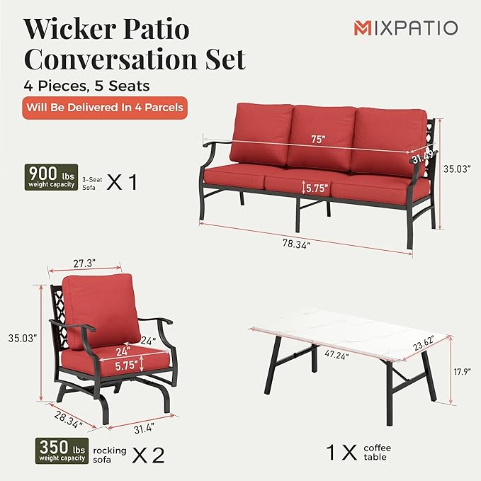 Patio Furniture Set 4 pcs, Outdoor Patio Furniture, 3-Seat Sofa, 2 Rocking Chairs, Coffee Table and 5.75" Extra Thick Cushions, Conversation Set for Backyard Deck, Red