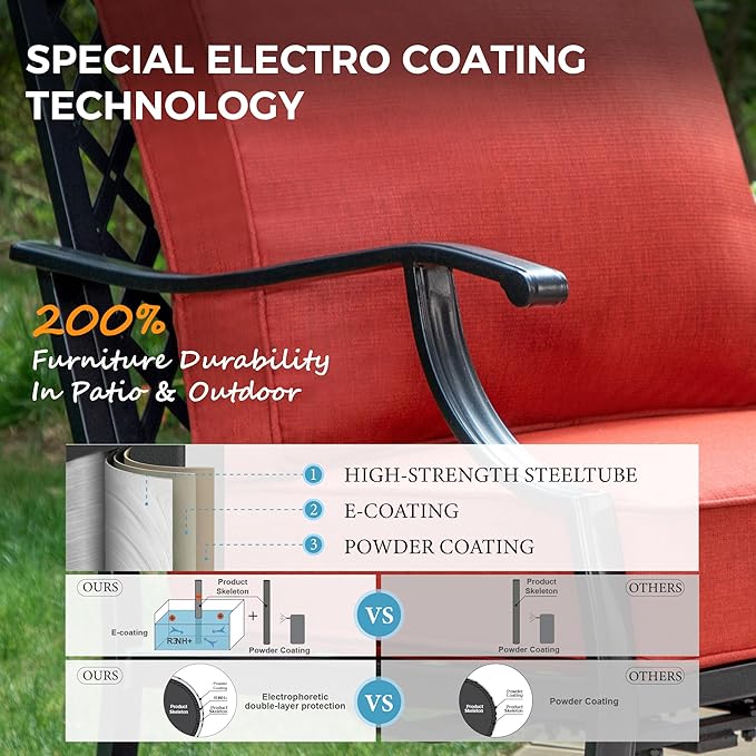 - 【RELIABLE ALL-WEATHER METAL CONSTRUCTION】Built from durable metal with E-COATING and POWDER-COATING finish, ensuring resistance to all weather conditions, rust-proof qualities, and easy maintenance. The sturdy wrought iron frame can withstand various weather conditions, with the single chairs supporting up to 350 lbs and the 3-seater sofa accommodating up to 900 lbs, promising long-lasting reliability and durability