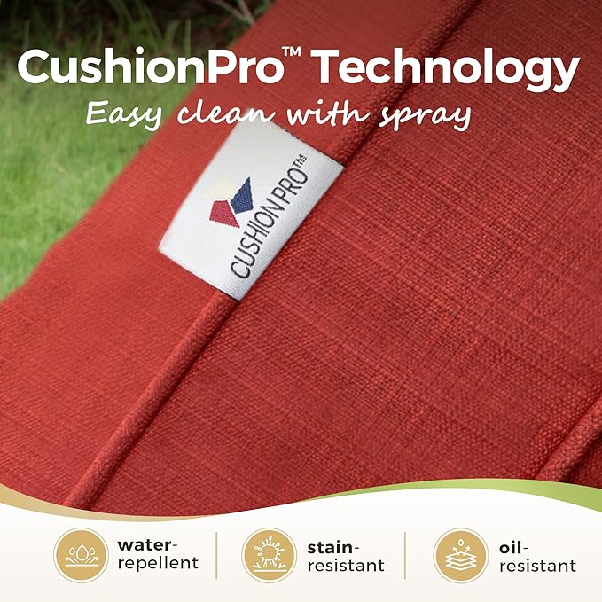 - 【INNOVATIVE CUSHIONPRO TECHNOLOGY】The patented CushionPro outdoor fabric provides advanced water-repellent, soil-release, and stain-resistant properties for easy maintenance. Simply using a sponge and cleaning spray keeps your outdoor furniture looking fresh and inviting