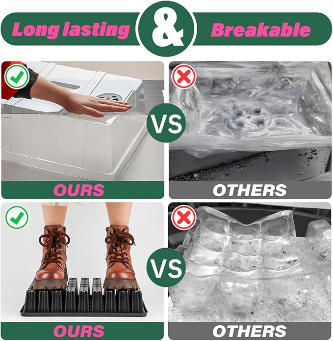 - 【5in Taller Clear Lids】Rootrimmer’s seed starting trays feature extra-tall 5-inch transparent domes that offer superior protection and durability compared to similar products. These insulated domes keep your delicate seedlings safe from cold temperatures, creating an ideal warm environment for rapid growth. Plus, the clear lid allows you to watch your plants thrive and track their growth progress.