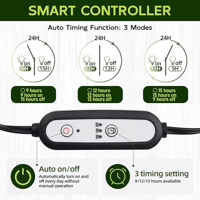 - 【Auto Turn On/Off Timer Everyday】: This plant growth light offers three cycle timing settings. It can remain on for 9, 12, or 15 hours, and then turn off for 15, 12, or 9 hours, respectively. Furthermore, it will automatically turn on and off at the same time every day.. This light provides a convenient way to ensure your plants receive proper care, even when you are away at work or on vacation.