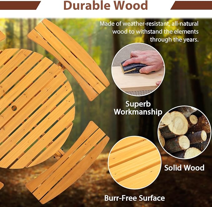 - 【High-Qulity Material】The circular table is made of 100% fir wood for high sturdiness and crack resistance, ensuring it can endure prolonged outdoor use. Thickened support frame ensures large weight capacity.