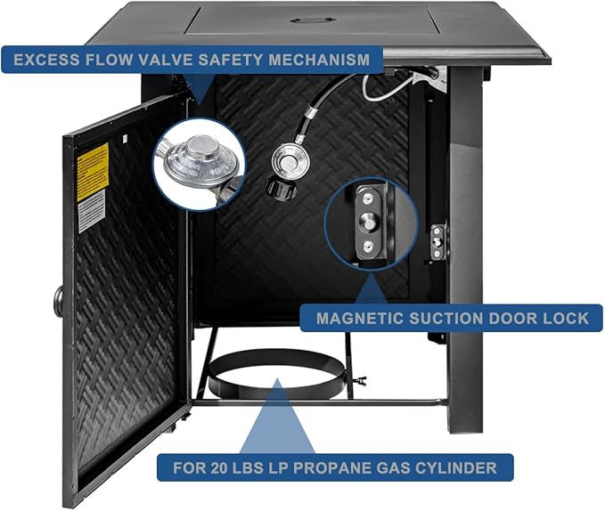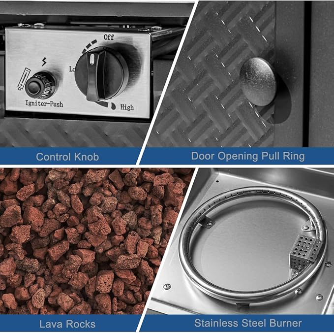 - ✅Smokeless Flame:You can light up the propane firepit table safely and adjust the flame to your desired temperature by turning the control button. The side door panel can be easily opened to change and conceal the propane tank, work with a standard 20-pound propane tank (NOT INCLUDED). Safety Note: When setting up the propane tank to keep the hose and valve away from the high-temperature area.