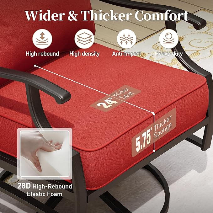 - LUXURIOUS 5.75" EXTRA THICKER CUSHION: This patio furniture set comes with a 5.75-inch extra thick soft cushion filled with 28D density sponge with high resilience for comfortable sitting. Enjoy a comfortable ride even if you use it for a long time, and say goodbye to the worries of collapsing seat cushions
