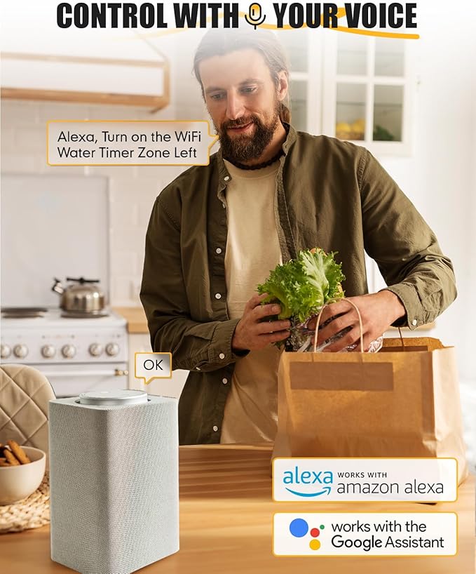 - Flexible Manual Watering:The manual watering time for each zone can be set from 1~59 minutes, and you can enable manual watering for the left/right/two zones via the APP, the button on the water timer, or voice commands to Alexa/Google Assistant.