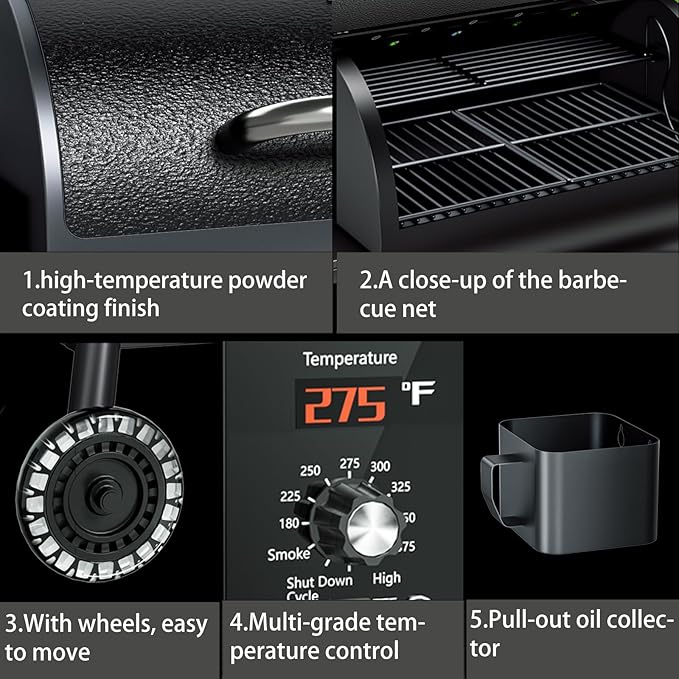 - PRECISION TEMPERATURE CONTROL: Features PID intelligent temperature control technology to maintains a ±15°F temperature control. The temperature range is 180-425°F. (Avoid frequent opening the lid, it will affects furnace temp and cooking effect.)