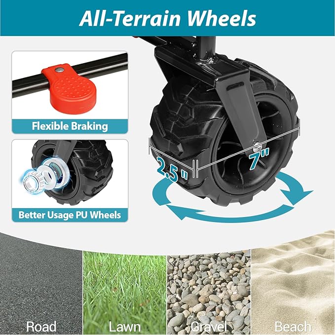 - Durable Wheels: Its four 7 inch PU tires are made of premium and durable rubber material, has better elasticity, abrasion resistance and puncture resistance. 360° smooth rotation Low noise tires with brake pad in the back can flexible and easy to control the direction. The big wheels for all terrain, can drive on the lawn, gravel, beach, etc.