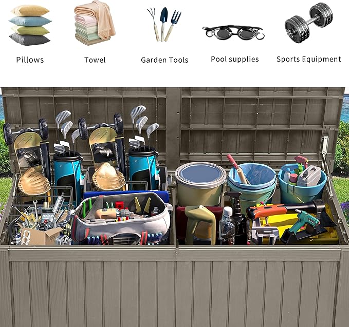 - Versatile Use: As a lockable storage box, it effortlessly integrates into any yard or patio; Ideal for storing furniture cushions, gardening tools, pool accessories, and more. The top layer can double as an extra table or stool with a stylish wood-like texture. Please note: the color may appear darker indoors and lighter outdoors; Always empty the box before moving to prevent accidents