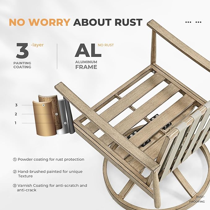 - Powder-Coated Aluminum Frame: Our outdoor patio dining set boasts an all-aluminum frame that is incredibly durable with its powder-coated surface. The combination of these features guarantees maximum stability and protection from rust and rain damage. Each chair supports up to 250 LBS. Furthermore, the frame surfaces are meticulously hand-brushed by skilled craftsmen, creating a unique texture that adds an elegant touch to your dining area.