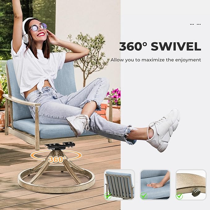 - Dining Chair with Swivel Base: The outdoor dining chair is designed with a 360-degree rotation base, providing greater flexibility than other patio chairs. You can rotate it in any direction to suit your needs, allowing for extra leisure and relaxation.