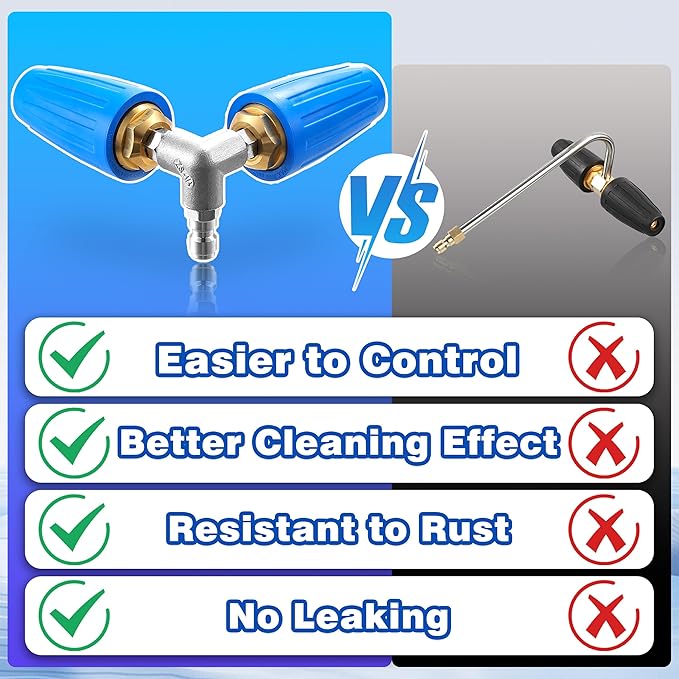 - 【Easy to Control】Pressure washer gutter cleaner attachment is lighter and easier to control than other pressure washer gutter cleaners. The 360°Angle between two rotating turbo nozzle allows the water column to more strongly impact the stubborn dirt on the surface of gutter, which can help you efficiently clean clogged and cluttered gutter.