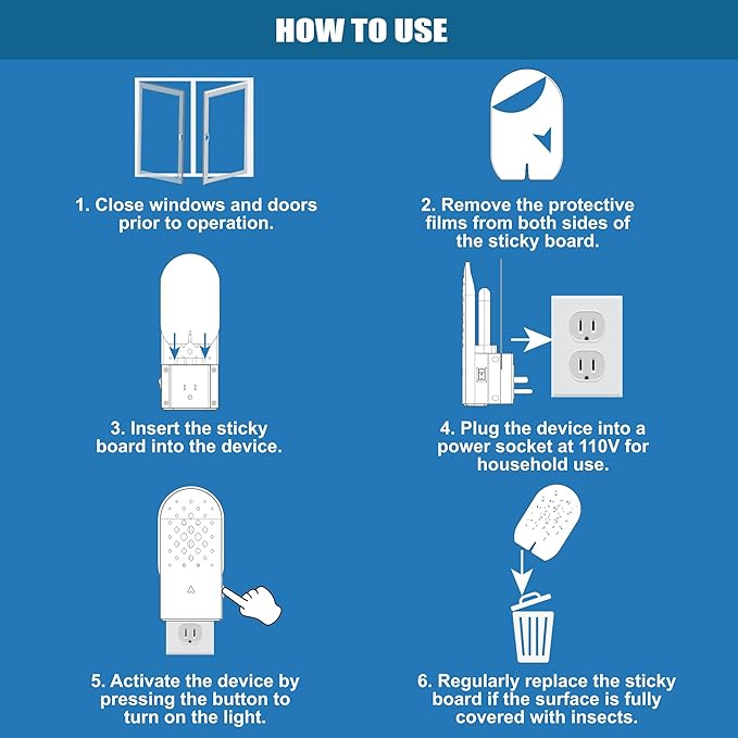 - FOR BETTER RESULTS: When using the device, it is advisable to close doors and windows, turn off all other lights and maintain no-body surroundings. Continuous use for 1-2 weeks to see a significant result. Please regularly assess effectiveness by monitoring the caught insect number on the sticky board. When the number of captured flies is minimal, it may be time to relocate.