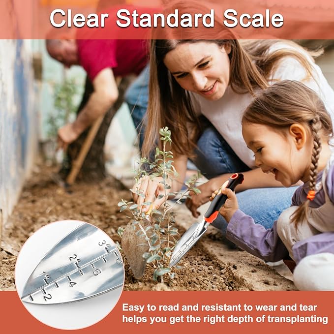 - Upgrade Garden Shovel:This hand shovel is very sturdy with measurement mark. The depth markers of the garden trowel allow you to measure soil depth in inches or centimeters (up to 4 inches). No other tools or measuring devices are needed to plant your bulbs and other small seedlings at the right depth, allowing you to achieve optimum growth conditions for your plants.