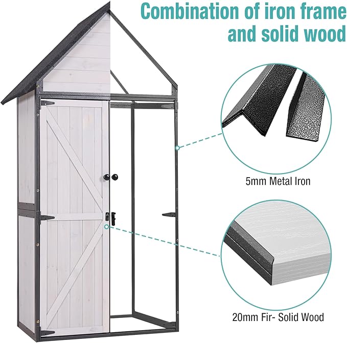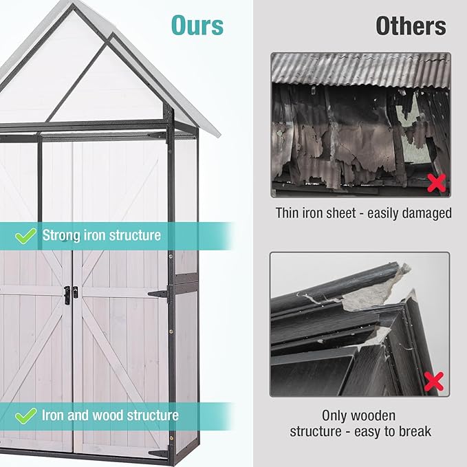 - Waterproof Design: The garden storage tool shed features a sloping roof to prevent water pooling and an elevated wooden floor to avoid water ingress, ensuring dry and safe storage.