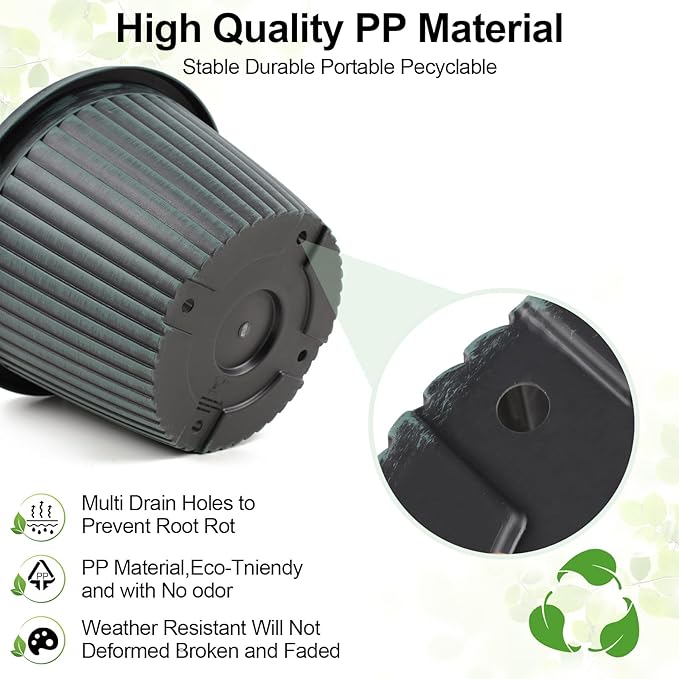 - 【Perfect Size & sturdy Material】Top diameter: 14 inch, bottom diameter: 9.6 inch, height: 9.8 inch, capacity: 5 gallon. Plastic plant pots are made of recyclable polypropylene resin which is lightweight but sturdy, not easy crack. These indoor outdoor planters are UV and weather resistant. 14 inch flower pot is perfect for planting medium to large sized plants.