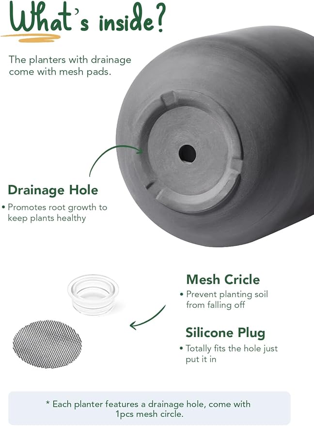 - Drainage Hole & Accessories: Each indoor planter pot features carefully designed drainage hole to maintain optimal soil moisture; The inclusion of silicone plugs and mesh pads provides added convenience, giving you flexibility in how you care for your plants