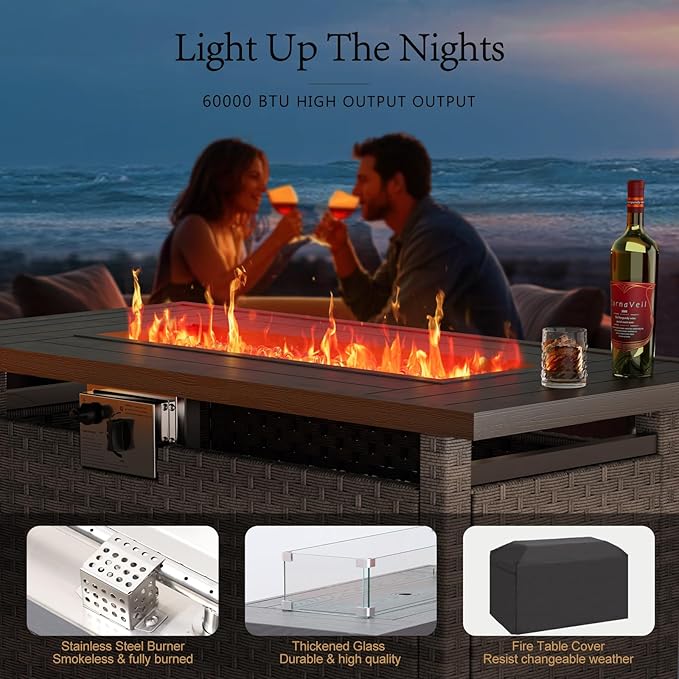 - 🌟【CSA Certified 60,000BTU Fire Table, Safe and Efficient】ABCASA smokeless propane patio fire pit table has passed CSA certification to make sure the quality and safety.Equipped with a stainless steel burner, auto-ignition button. Easy to install and start.Flame height adjustment, it can heat up to 60,000 BTU. Our firepit table also has a widened tabletop, you can use it as an outdoor dining or coffee table.You can enjoy the warm and pleasant leisure at outside
