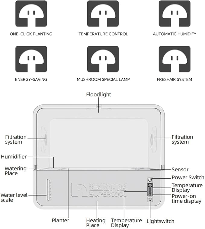 - 【ONE-CLICK PLANTING】Push the power to monitor light,moisture and temperature with one click,creating a simple and efficient mushroom growing system for you.It usually takes weeks to cultivate mushrooms in an indoor farm,but only a few days in the mushroom growing kit.The growth rate of mushrooms can be seen with the naked eye,making it an intelligent gardening assistant that requires no human monitoring.
