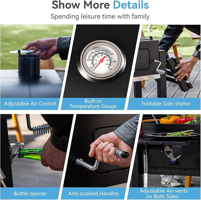 - DISTINCTIVE DESIGN: The lid-mounted temperature gauge instantly displays temperature changes; the dual side damper design maximizes airflow for efficient burning and temperature control, while the smoke stack with an adjustable cap allows for additional airflow