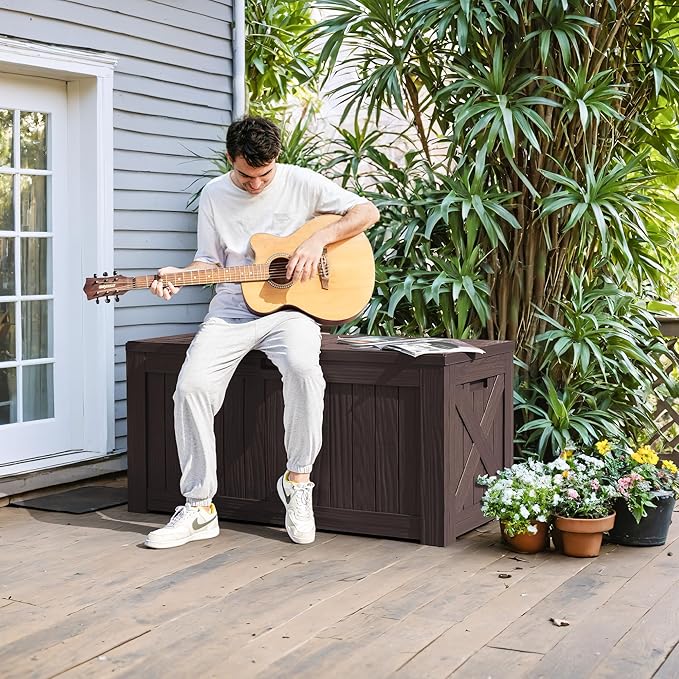 Greesum 120 Gallon Deck Box, Resin Outdoor Storage Container for Patio Furniture, Garden Tools, Pool Accessories, Weatherproof, Lockable, Brown
