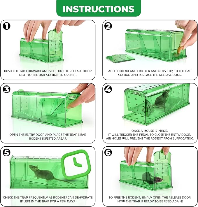 - Easy to Use: Simply place the bait in the designated area and open the spring door. Once the mouse is trapped it will trigger the pedal to close the entry door.