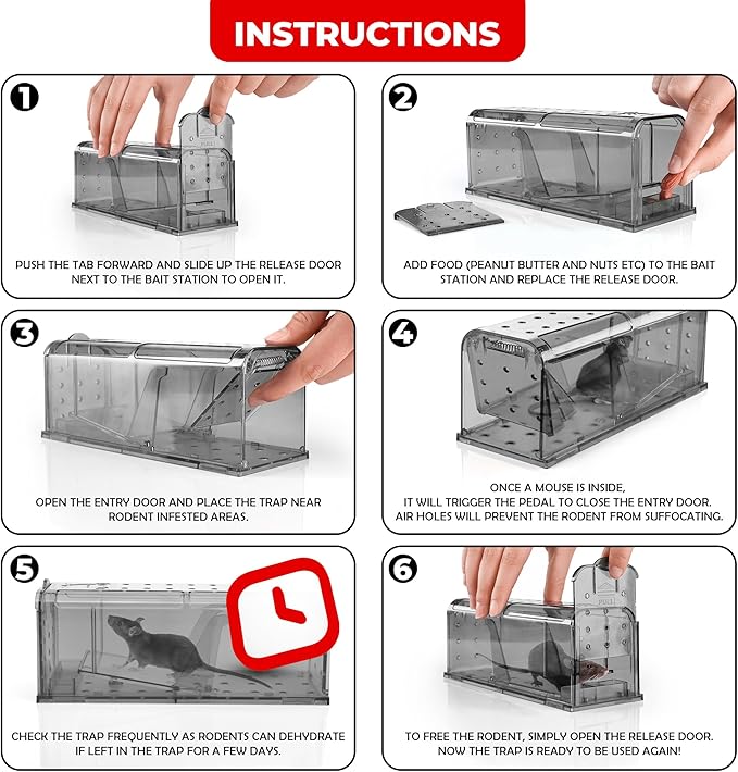 - Easy to Use: Simply place the bait in the designated area and open the spring door. Once the mouse is trapped it will trigger the pedal to close the entry door.