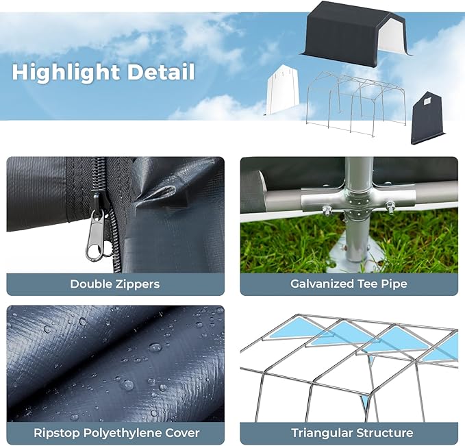 - 【Enhanced Durability with Galvanized Tubes 】Our storage sheds boast a heavy-duty, rust-resistant galvanized steel framework and metal corner joints. The galvanization process ensures protection against chipping, peeling, rust, and corrosion. Plus, the tool-free frame design allows for swift and effortless assembly.