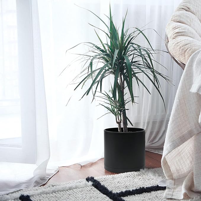 D'vine Dev 2 Pack 10 Inch Modern Plastic Plant Pots, Cylindrical Garden Planters for Plants with Drainage Holes and Saucers, Black, 74-Y-N-1