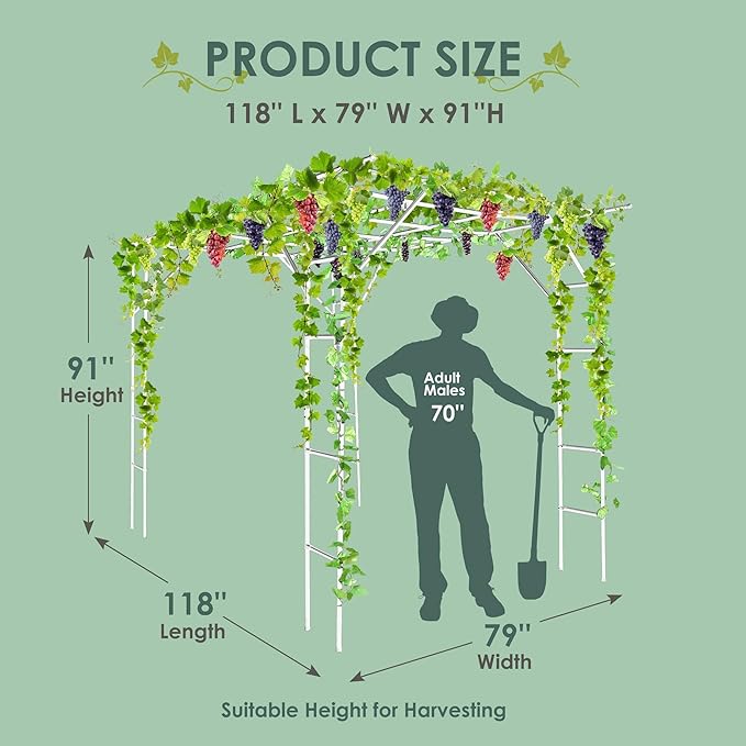 - Suitable Size -- Our grape vine support arch arbor is 118'' L x 79'' W x 90.5'' H, designed specifically for growing climbing plants and vegetables. It can provide enough growing space so that you can maximize your harvest and yield. And the plant trellis’ height is easy for you to pick the fruits or decorate your gardens.
