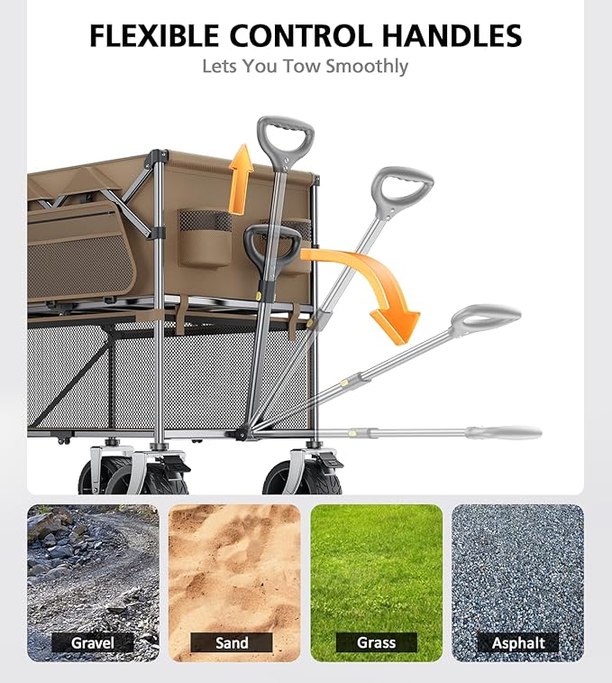 Sports Wagon Carts,480Lbs Double Decker Wagon,Foldable Lounge Wagon with Tank Wheels&Side Pocket&Dustbag,New Wave Garden,Camping,Shopping,Beach Wagon to Family Trips and Outdoors Time-Brown