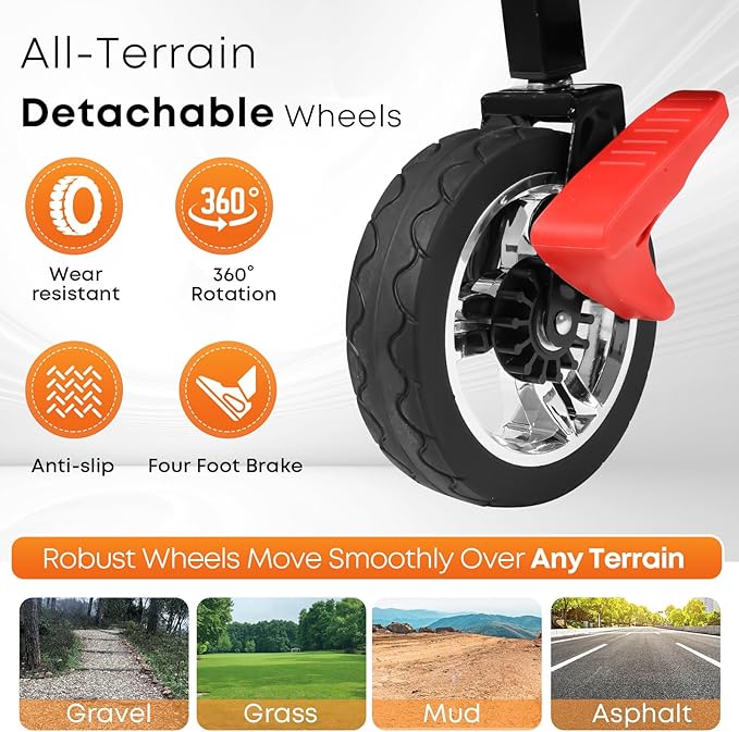 - [ALL-TERRAIN WHEELS] Kids wagon conquer sand, gravel, grass, and slopes effortlessly! The PU all-terrain wheels with 360°rotating front wheels and four-wheel brakes ensure smooth maneuverability and conquer all kinds of terrain