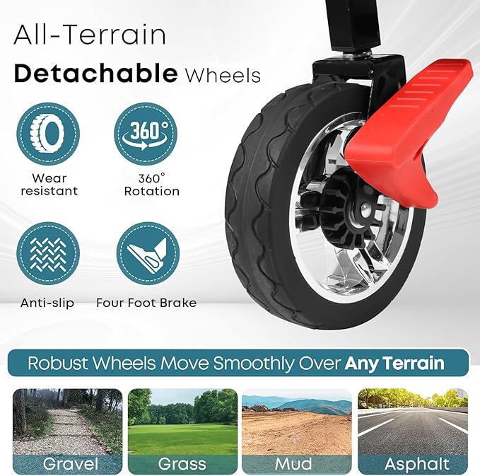 - [ALL-TERRAIN WHEELS] Wagon stroller for 2 kids conquer sand, gravel, grass, and slopes effortlessly! The PU all-terrain wheels with 360°rotating front wheels and four-wheel brakes ensure smooth maneuverability and conquer all kinds of terrain