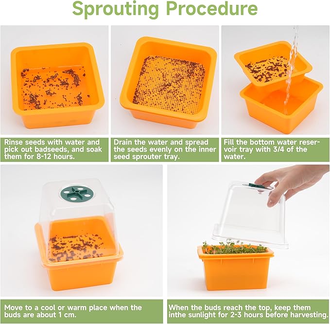 - 【Beginner-Friendly】 Simply soak your seeds, rinse and drain them, then place the sprouting tray in direct sunlight.(PS:We recommend adding 400 ml (about 13.5 ounces) of water to the base tray at a time. The water should not completely cover the seeds.)