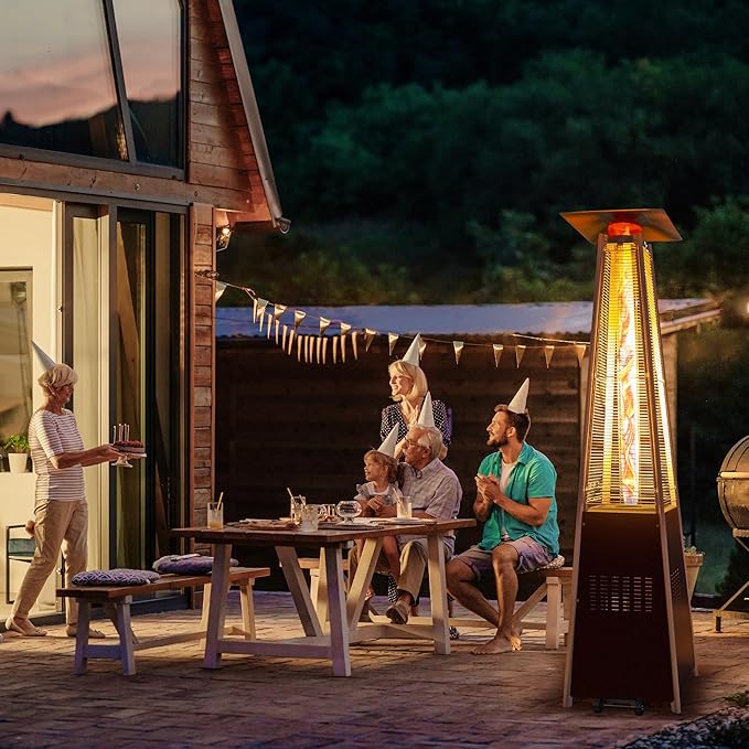 - 🔥【Eye-Catching Flame】 Standing at 89.4 inches tall, this pyramid patio heater boasts a captivating glass flame tube that enhances any outdoor setting.