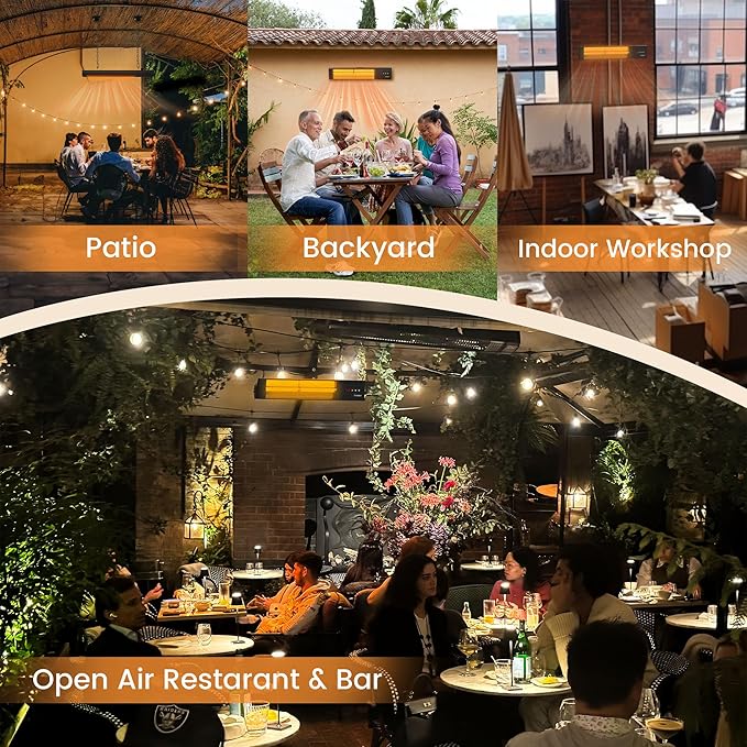 - POWERFUL HEATING FOR INSTANT COMFORT: Patio heater experiences powerful 1500W heating capacity with advanced graphene technology. The outdoor heater heats up instantly in just 0.5 seconds, electric patio heater delivering warmth up to 12 feet. Perfect for quick relief from the cold, infrared electric heater ensures your comfort in no time—no waiting, no shivering, just immediate, efficient warmth! This makes it an ideal infrared outdoor electric space heater—fast and powerful heating. VERSATILE INSTALLATION FOR ANY OUTDOOR SPACE: Wall-mounted heater lets you enjoy flexible installation with two mounting options—hang it from the ceiling for wide coverage or mount it on the wall for targeted heating, making it perfect for any outdoor space. Its hassle-free assembly requires just 3 simple steps, with most components pre-installed for quick setup. Suitable for various settings like gazebos, patios, or even as a garage heater, it adapts to your needs for both style and functionality. CUSTOMIZED HEATING EXPERIENCE AT YOUR FINGERTIPS: The 36-hour timer function, 4 adjustable heat levels, and memory function allow you to customize your heating experience. You can set the time and heat level according to your preferences. The outdoor space heater turns off automatically when the time is up, and the next time you start it, the patio heaters for outdoor use will automatically adjust back to the last heat level used. Enjoy a personalized heating experience tailored to your liking. SAFETY-FIRST DESIGN FOR OUTDOOR COMFORT: Designed with a modern aesthetic and your safety in mind, this radiant heater features overheating and tip-over protection, automatically shutting off power in risky situations to keep you and your family safe. These outdoor heaters for patio provide the ideal heating solution for a gazebo, balcony, BBQ area, or as an infrared heater. Its design and safety features make it perfect for outdoor comfort and peace of mind. MAXIMUM POWER OF 1500W: Due to the standard 110V US electrical outlet, the heater operates at a maximum power of 1,500W. In extremely cold weather conditions, the heater may have limited ability to warm the surrounding outdoor area effectively. Ideal for moderate to chilly climates for optimal performance