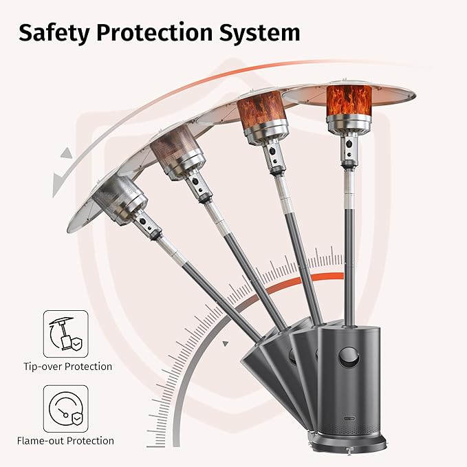 - ๐ฆ๐ฎ๐ณ๐ฒ๐๐ ๐ฃ๐ฟ๐ผ๐๐ฒ๐ฐ๐๐ถ๐ผ๐ป ๐ฆ๐๐๐๐ฒ๐บ: The Tip-over Protection system will shut off the flame when the patio heater propane is tilted more than 45 degrees. If the flame goes out, the Flame-out Protection system automatically shuts off the gas supply