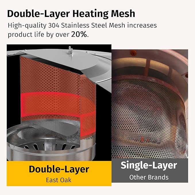 - ๐ ๐ผ๐ฟ๐ฒ ๐๐๐ฟ๐ฎ๐ฏ๐น๐ฒ ๐๐ผ๐๐ฏ๐น๐ฒ-L๐ฎ๐๐ฒ๐ฟ ๐๐ฒ๐ฎ๐๐ถ๐ป๐ด ๐ ๐ฒ๐๐ต: High-quality 304 stainless steel is engineered into our double-cover heating mesh design. Compared with a traditional single-layer burning mesh heater, the EAST OAK Outdoor Heater is more powerful, durable, and safer. All these improvements deliver a 20% longer product life