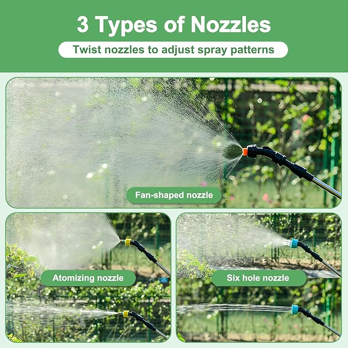 - 🍃【Multi-functional Sprayer】The battery pump sprayer comes with 3 types of nozzles (Atomizing nozzle/Fan-shaped nozzle/Six hole nozzle), you can adjust the strength of the spray by twisting the nozzle's looseness and tightness. Whether you need a fine mist for delicate plants or a more powerful spray for your lawn, our garden sprayer can easily meet your daily needs. The retractable wand extends up to 23.6in to help you spray hard-to-reach places, take care of your lawn or clean your home!