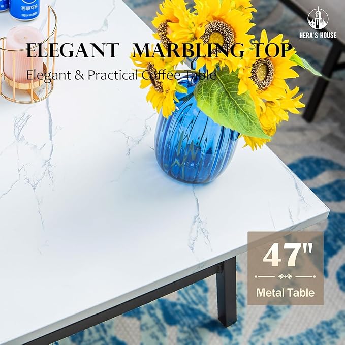 HERA'S HOUSE 6 Piece Patio Furniture Set, 4 x Fixed Metal Cushioned Chair, 1 x 3-Seat Sofa with Marbling Coffee Table, All Weather Outdoor Conversation Set for Lawn Garden Backyard, Navy Blue