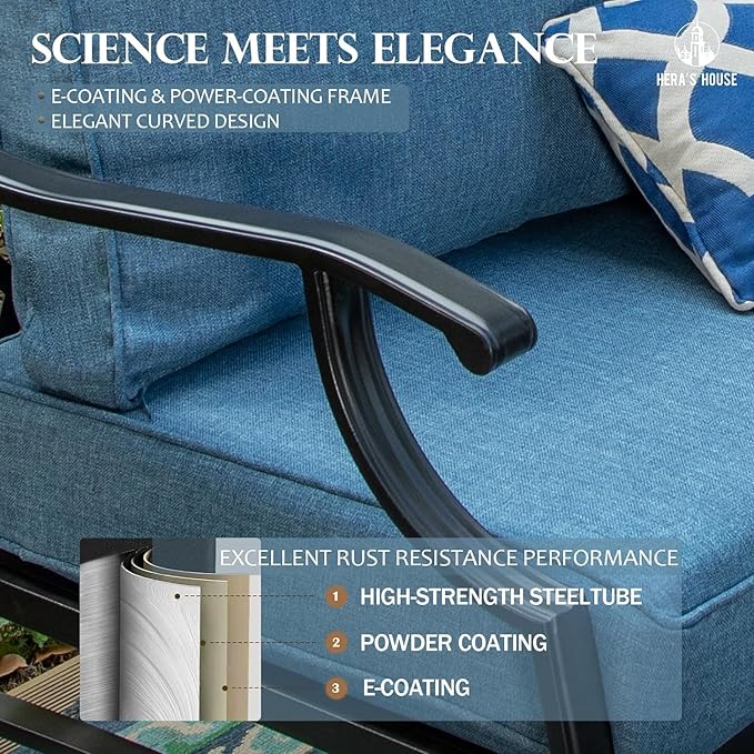 - 【E-COATING & POWDER-COATING TECHNIQUE】ALL the HERA'S HOUSE metal frame of conversation sets are processed by high-performance E-COATING and POWDER-COATING technique which provides extended protection against rust, scratches, rain, and UV harm. All weather resistant, anti-rust, easy to clean, no special care needed.