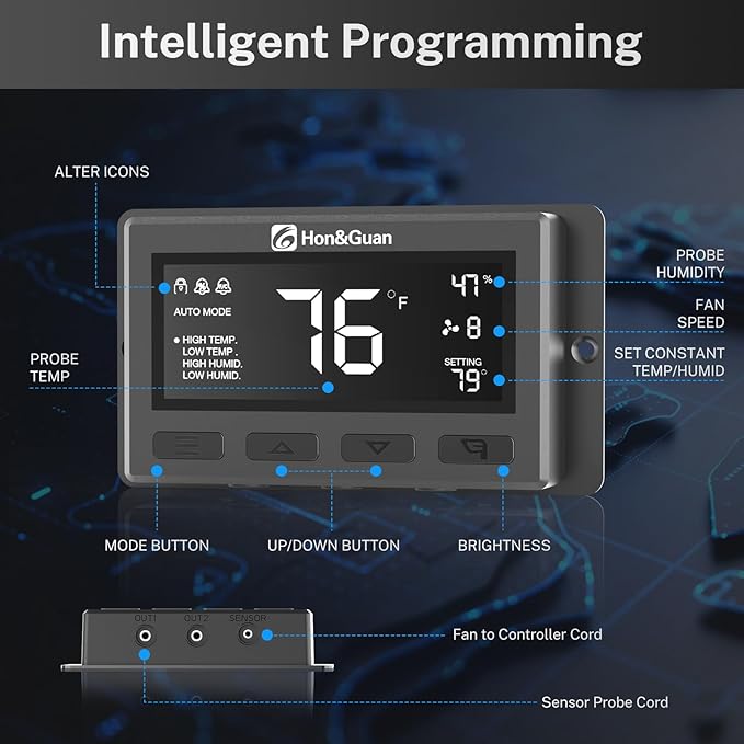 - 【Temperature, Humidity, & Speed Control】: Hon&Guan grow tent inline fan is equipped with an intelligent controller featuring multiple operation modes (auto mode, high temp, low temp, high humid, low humid, timer, alarm) and 10 fan speeds. With the included environmental probe, it can automatically monitor changes and control humidity and temperature, creating the optimal ventilation for your grow space