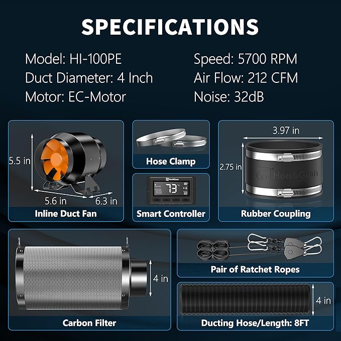 Hon&Guan 4 Inch 212 CFM Air Filtration PRO Kit for Grow Tent Ventilation System, 4" Inline Duct Fan with EC Motor, Smart Temperature Humidity Controller, 4" Carbon Filter & 8 Ft Ducting