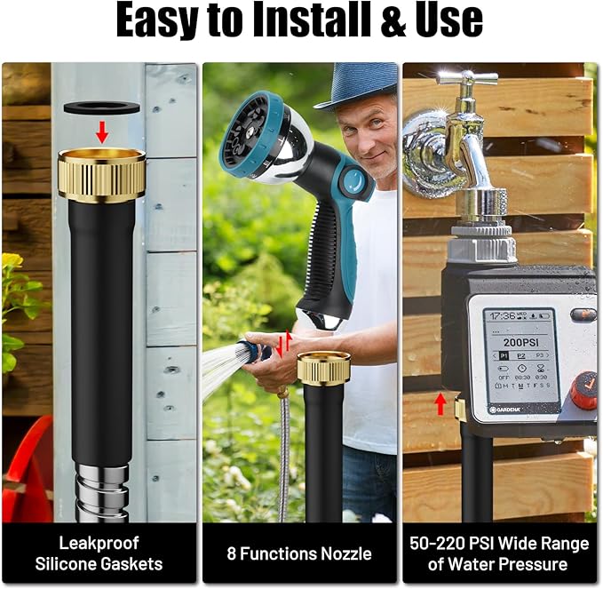 - Flexible and Lightweight - New upgraded metal water hose is 50% lighter in weight, 220PSI water hose pressure, suitable for temperatures from -30ยฐF to 105ยฐF. The lightweight and flexible water hose comes with a 3/4โ fitting standard connector. It can be ordered as 50 feet, 75 feet or 100 feet long, giving you complete control over your watering tasks