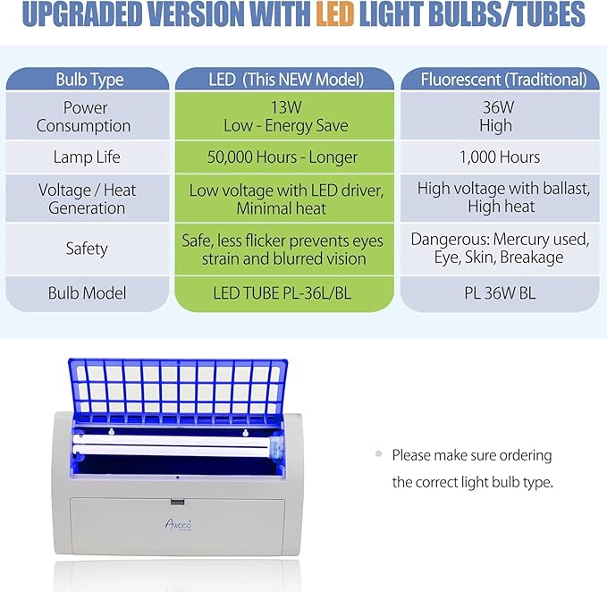 - [Upgraded Version with LED UV Light] - New upgraded LED UV lights are more energy efficient than fluorescent light bulbs while providing a brighter lighting. Save money and maintenance cost with these new LED UV lights that are more durable and don’t flicker near the end of their life. No flickering prevents eye strain and blurred vision compared to fluorescent light bulbs.