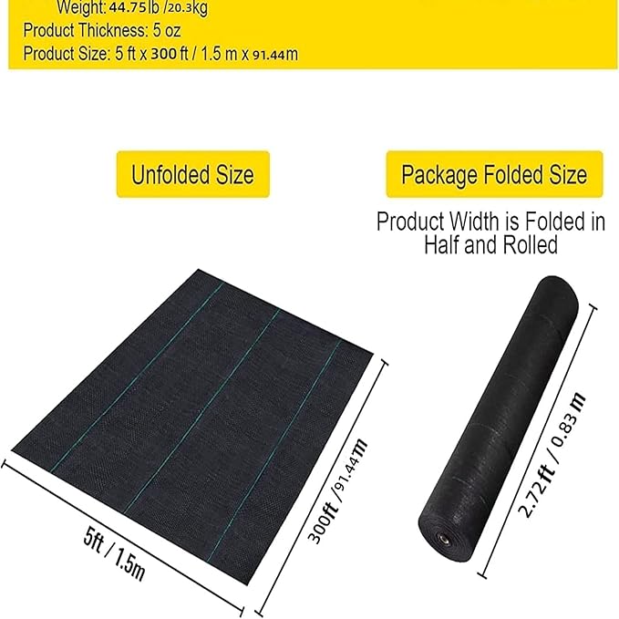 - High Strength & Durability: GarveeLife 5.0oz heavy duty landscape weed barrier fabric, made of tightly woven polypropylene fabric needle which punched with UV-stabilized. 98.7% opaque to light, Prevents weed seeds buried in the soil beneath from sprouting. The durable weed blocker fabric will highly increase your productivity and Economic benefits. Size: 5 x 300 ft / 1.52 x 91.4 m