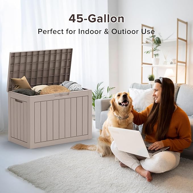 - Spacious 45 GallonStorage Capacity – With dimensions of 30.75" x 17.13" x 21.85", this large storage box holds garden tools, cushions, pool accessories, and more, keeping your outdoor space organized and clutter-free.