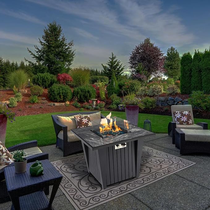- 🔥🔥【What you can get from it】This fire pit tables for outside patio with Marble tabletop, Fire pan and Stainless Steel burner, Gas regulator, Pulse Ignition, Safety thermocouple, all assembled, and Steel panels , Decorative Mixed color Glass Rocks, Waterproof Cover, Steel Lid.