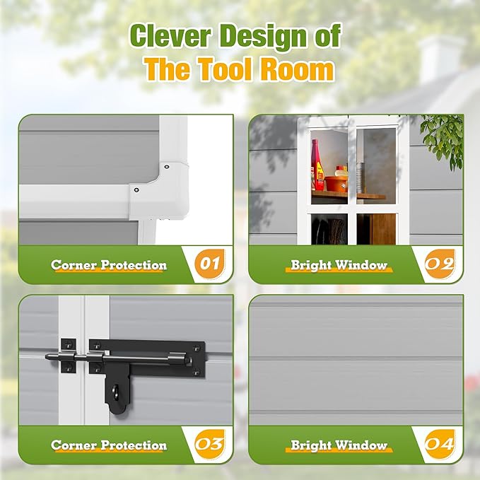- ECO-FRIENDLY MATERIAL: The shed is made of green polyethylene resin plastic, which can be recycled at the end of life. In addition, this material is weather resistant, waterproof and UV resistant, and will not peel off, strong and durable.