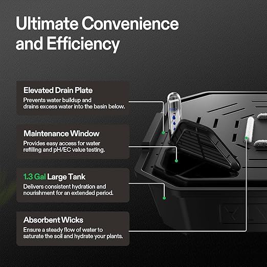 - Gridded Maintenance Window: Provides easy access for water refilling and pH/EC value testing; Allows for quick and tidy plant feed adjustments