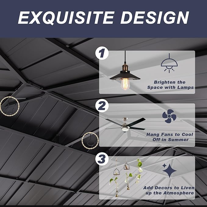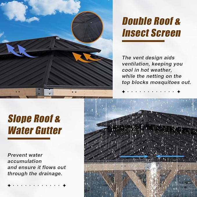 - Ventilated Roof with Condensation Control - The permanent all weather gazebo features a dual metal hardtop roof that ensures proper airflow, helps reduce condensation buildup ensuring a dry and comfortable environment, while providing a screen barrier against small creatures, ensuring a comfortable outdoor experience.